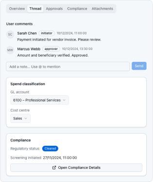 Every payment becomes a clear thread — approvals, checks, escalations, and decisions — so you have a trusted, auditable record from start to finish.